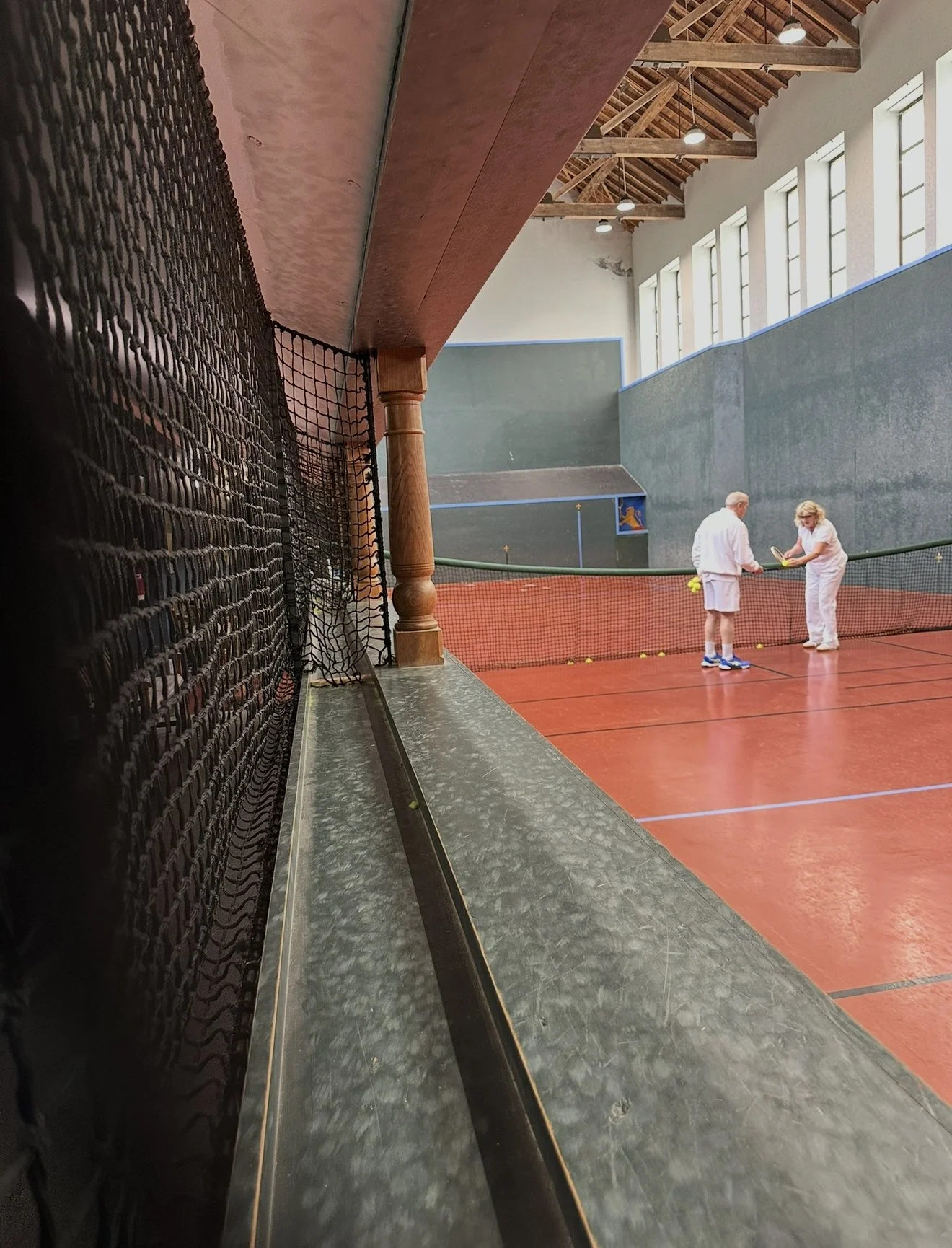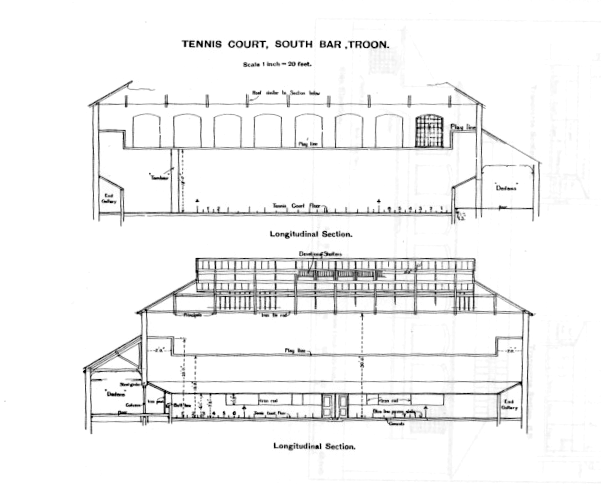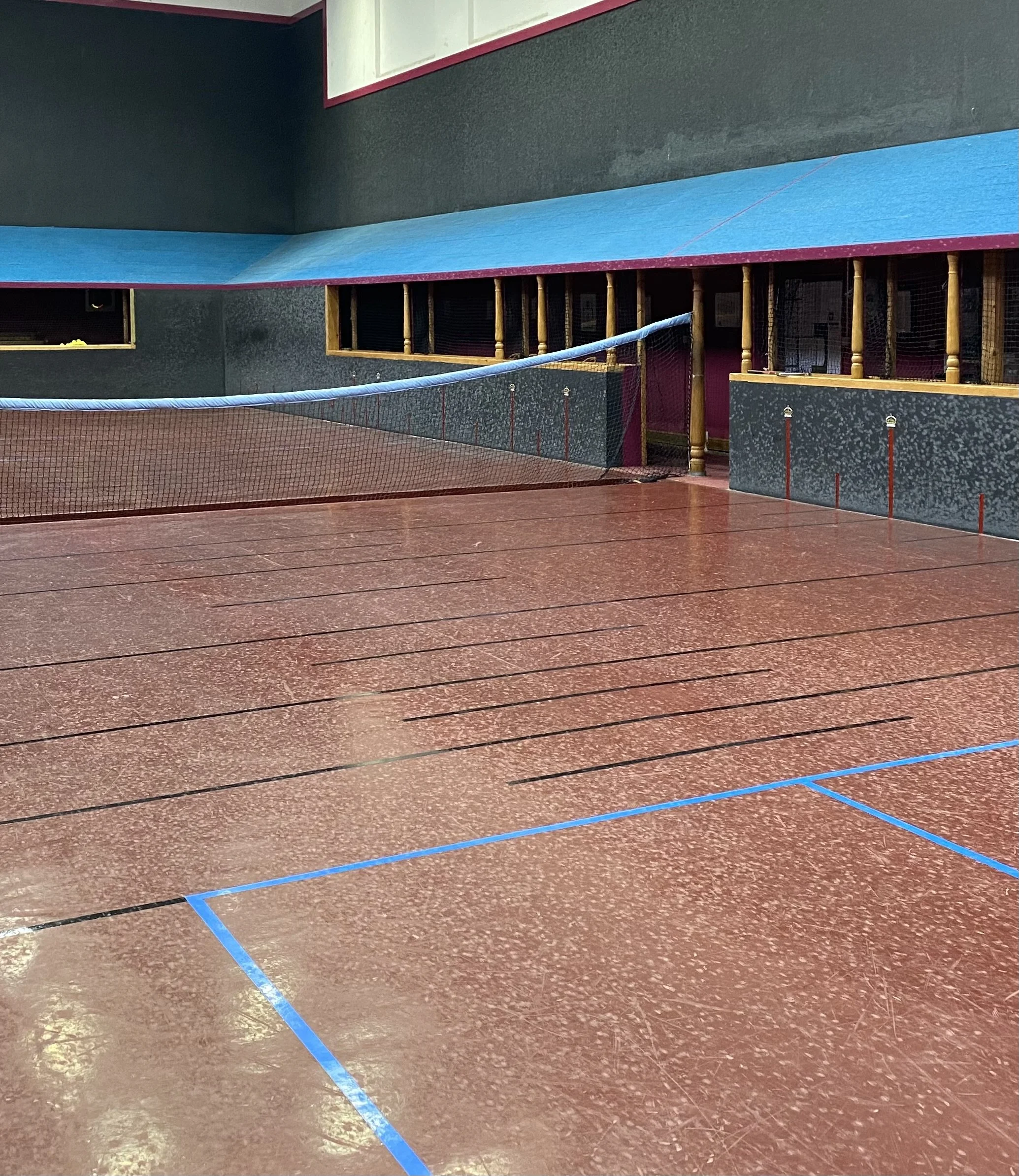 Constructed after the original Green Court in 1890, and again built by Joseph Bickley. The same construction as all his other courts, although the penthouse roof angle was 23.5 degrees rather than 22. In the 1930’s, squash courts were built inside the orginal real tennis court, and not until 1999, were the squash courts demolished and the space brought back to play real tennis again. The main wall was retained, but new galleries and penthouse roofs built using hard self-coloured plaster as the finished surface. The main feature was the viewing gallery at first floor level where a glass wall was installed to provide an amazing experience for spectators.